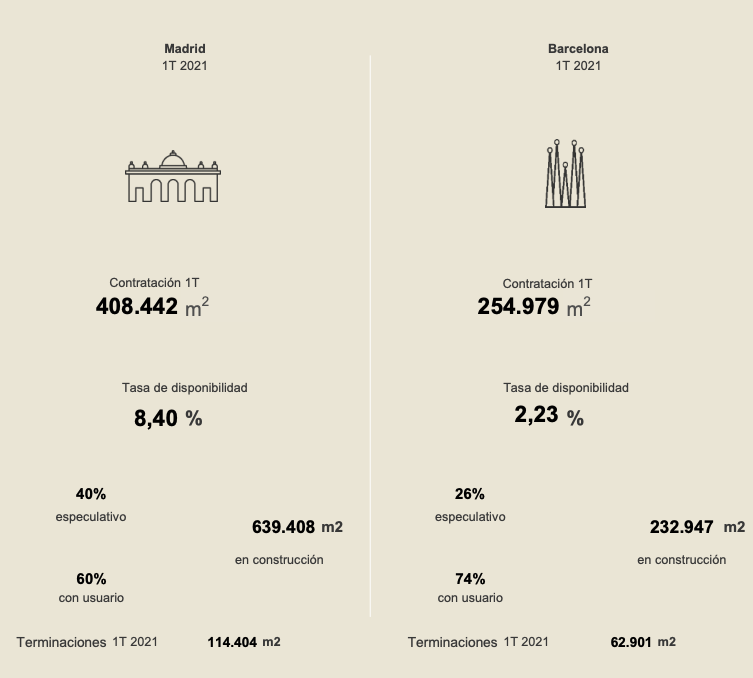 Por otro lado, en Madrid han alcanzado los 410.000 m² durante los tres primeros meses del año, que representa un crecimiento interanual del 165 % y trimestral del 60 %.